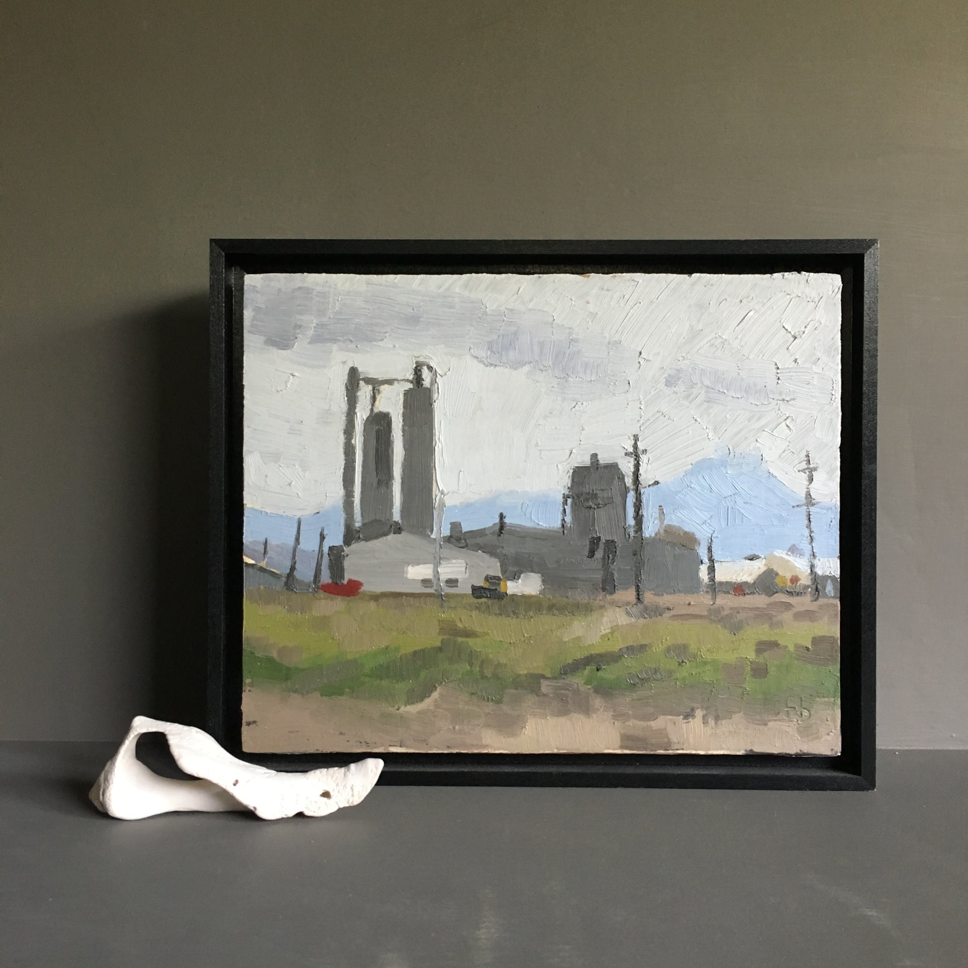 Original Plein Air Landscape Oil Painting - Lumber Mill in White City, Oregon by Sarah F Burns. It was a cloudy gray day, White City, Oregon is an unincorporated area with many lumber mills, an industry that had its heyday many years ago. Modern American Impressionist artwork.