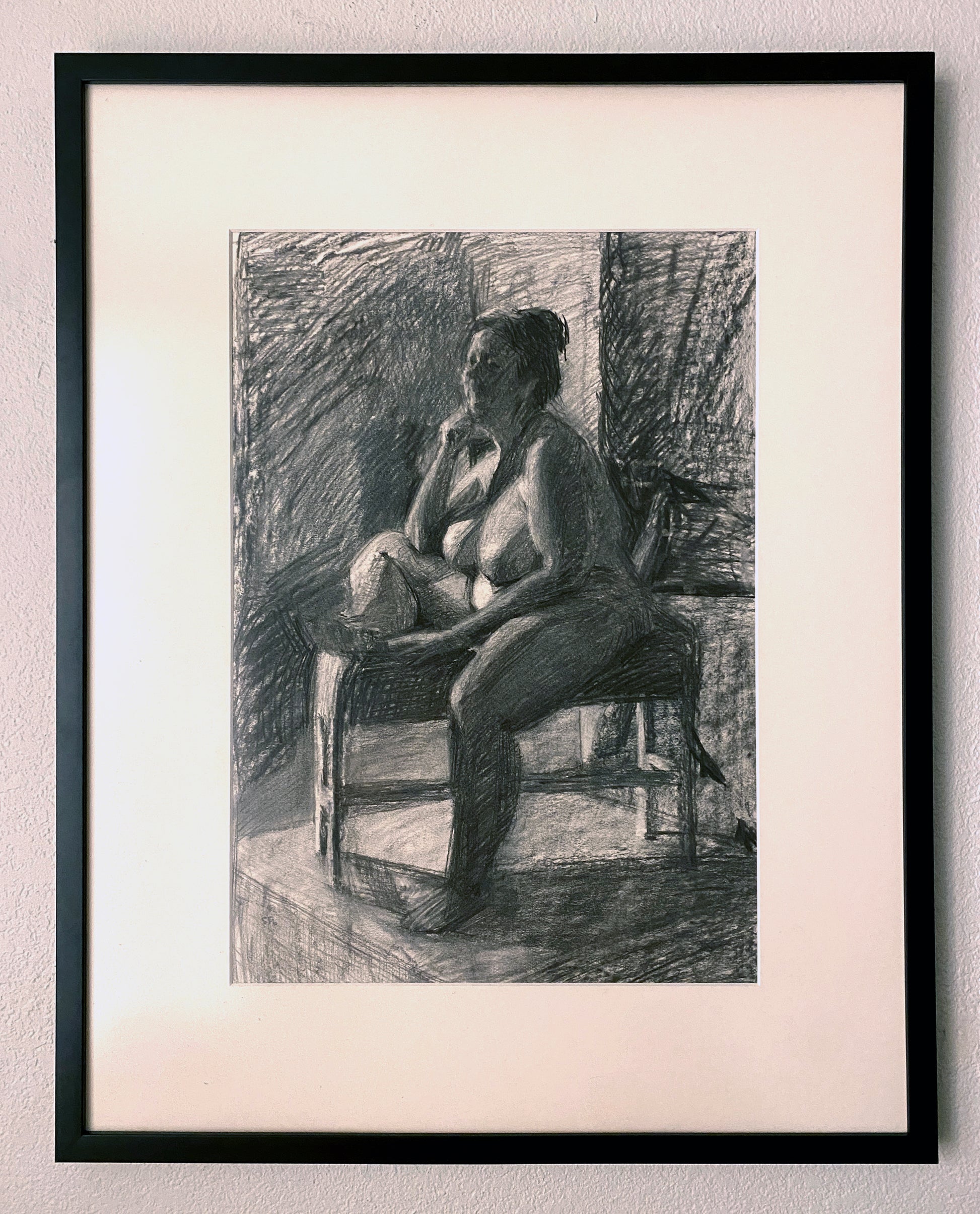 Original charcoal sketch of a seated female figure. Beautifully framed in charcoal colored wood and matted, with museum non-glare glass. Please forgive the terrible photo! The second image shows the a better photo of the same mat and frame.